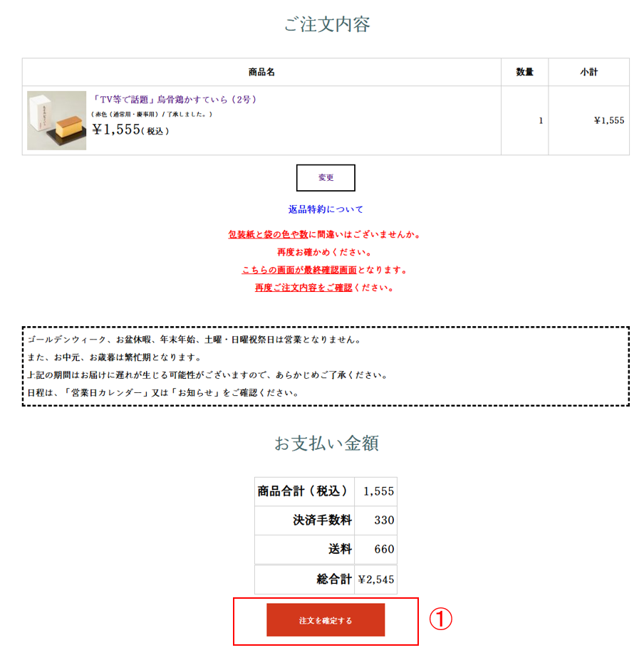 ①ご注文内容を最終確認していただき、問題なければ「注文を確定する」をクリックしてください。