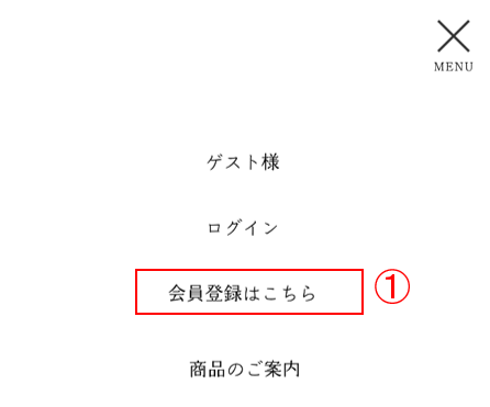 ➀右上にあります「MENU」から「会員登録はこちら」をタップしてください。
