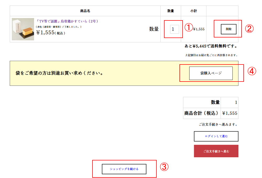 ➁カートに入っている商品が不要の場合は「削除」をクリックしてください。