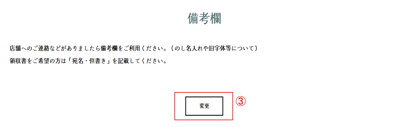 ➂その他詳細(のしの名入れ、領収書の宛名・但書き等)がございましたら、備考欄の「変更」をクリックして登録してください。