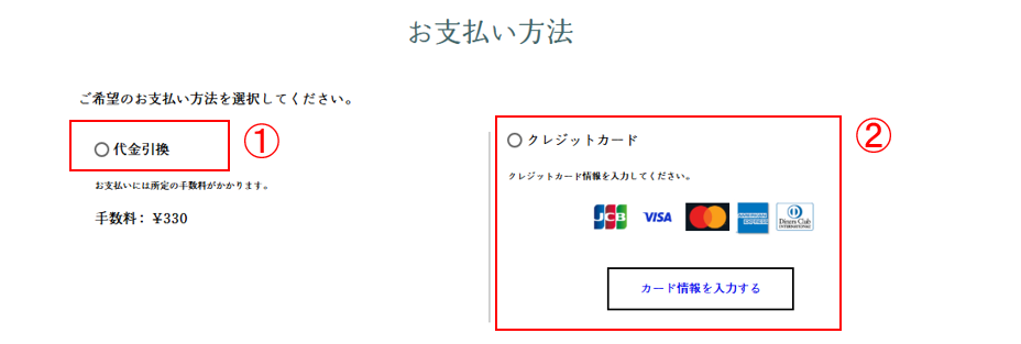 ➀代金引換をご希望の方は、「代金引換」の〇をクリックしてください。