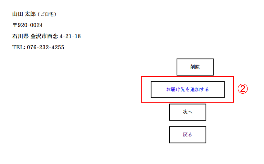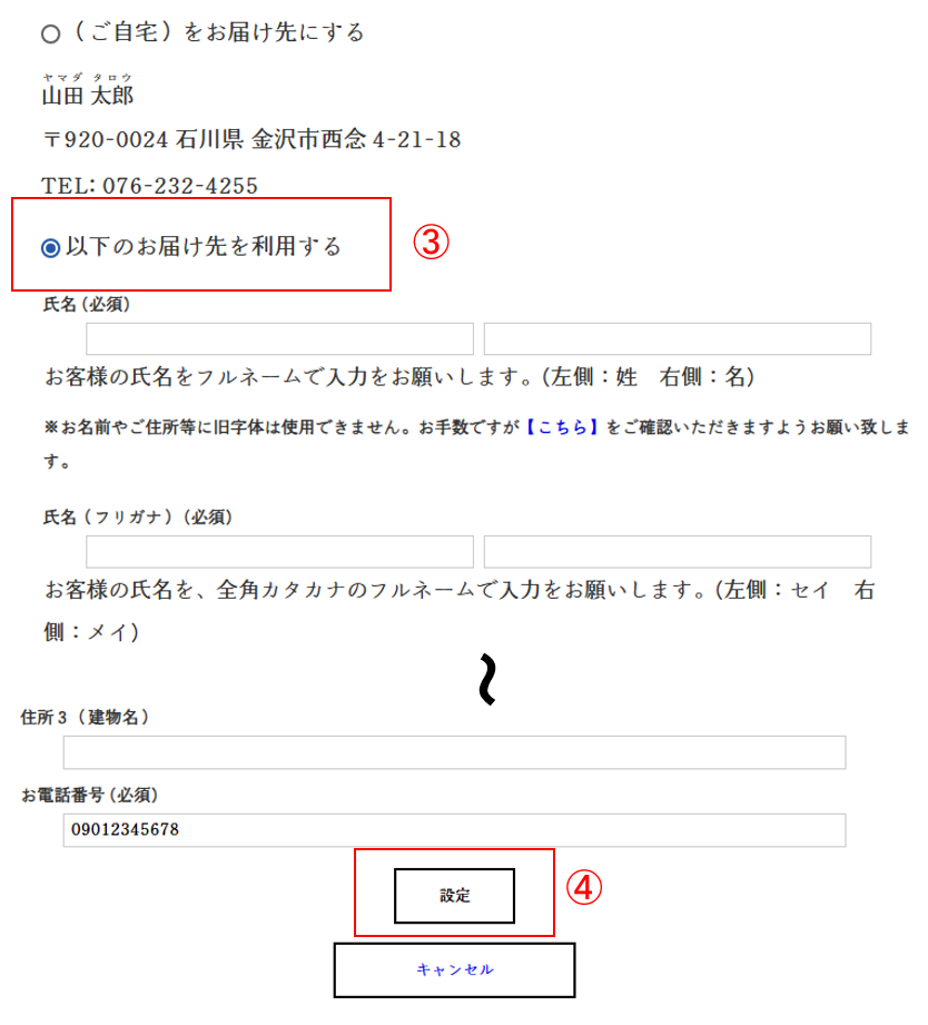 ➂「以下のお届け先を利用する」の〇をクリックしてください。