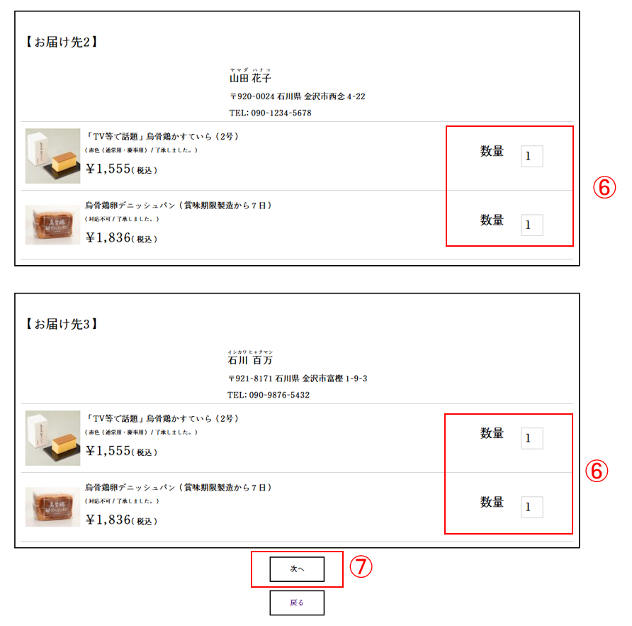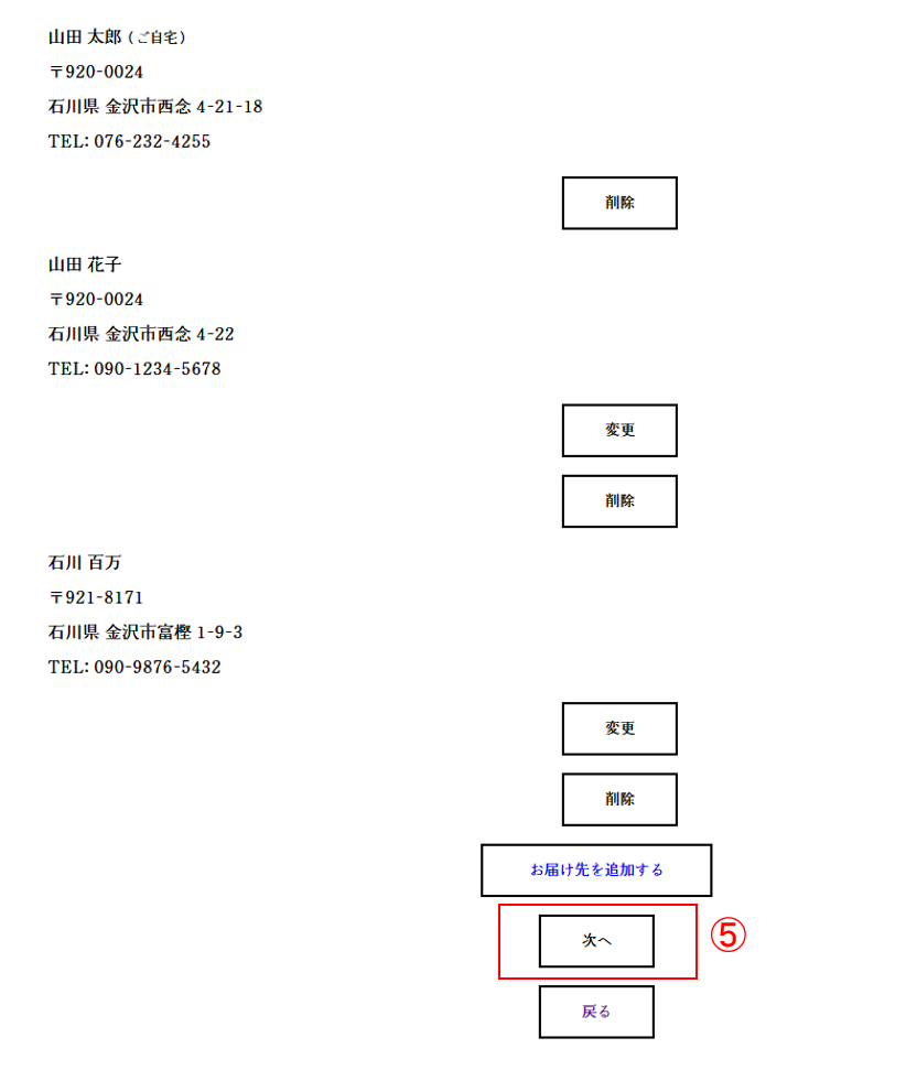 ➄今回お届けするお届け先様を全て登録後、「次へ」をクリックしてください。