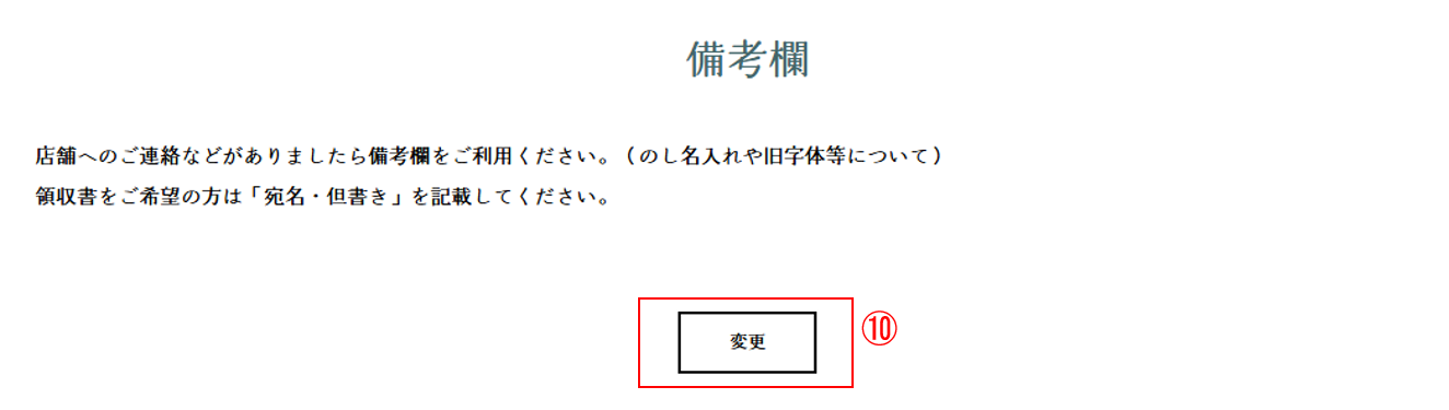 ➉その他詳細(のしの名入れ、領収書の宛名・但書き等)がございましたら、備考欄の「変更」をクリックして登録してください。